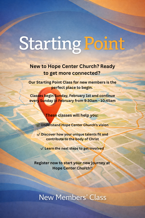 You’ll gain a clear picture of what Hope Center Church is all about, explore how your God-given gifts can be used to serve others, and learn simple ways to become involved in the life of the church. Whether you’re brand new or ready to go deeper, this class is for you.